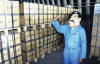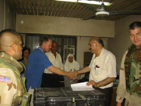 David Nummy (in the blue shirt) as US dollars (in the black box) are transferred to the Iraqis to pay pensioners in May 2203. |