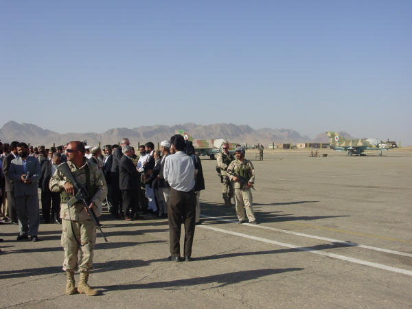 Welcome at Heart Airport guarded by U.S. soldiers with M-16s and Afghan mujahideen with AK-47s