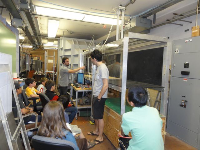 Graduate students John Axerio-Cilies and Emin Issakhanian operate a tunnel for wind turbine testing
