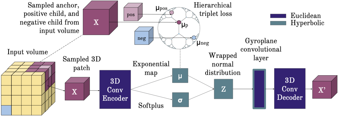 We consider the task of representation learning for unsupervised segmentation of 3D voxel-grid biomedical images. We show that models that capture implicit hierarchical relationships between subvolumes are better suited for this task. To that end, we consider encoder-decoder architectures with a hyperbolic latent space, to explicitly capture hierarchical relationships present in subvolumes of the data. We propose utilizing a 3D hyperbolic variational autoencoder with a novel gyroplane convolutional layer to map from the embedding space back to 3D images. To capture these relationships, we introduce an essential self-supervised loss -- in addition to the standard VAE loss -- which infers approximate hierarchies and encourages implicitly related subvolumes to be mapped closer in the embedding space. We present experiments on both synthetic data and biomedical data to validate our hypothesis.