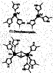 B. Explain the different oxygen binding behavior of the Co(II) prophyrin. From the data given in the problem, we deduce that Co(II) will only bind one axial imidazole, either 1,2-dimethylimidizole or 1-methylimidizole. Thus there is an open coordination site for O2 in either case. C. Why is the P1/2(O2) value unchanged when an additional amount of 1,2-dimethylimidazole is added to the Fe(II) dendritic porphyrin? Since a second 1,2-diMeIm does not bind, it cannot competitively inhibit O2 binding. D. For the two Co(II) dendritic porphyrins, which would have the highest affinity for binding O2 (expressed as K(O2) the equilibrium constant): the complex with the 1,2-dimethylimidazole or with 1-methylimidazole? Whith P1/2(O2) value would be larger? The 1-MeIm ligated system has the highest affinity for binding O2 therefore the P1/2(O2) of 1,2-dimethylimidizole is larger. E. Are any of these complexes diamagnetic; consider either metal, either axial ligand, and O2 as well. Indicate which specific complexes would be diamagnetic. The O2 complex of the Fe(II) porphyrin and the (1-MeIm)2 complex of the Fe(II) porphyrin would be diamagnetic. 2.* (1997 F 9) Hemocyanins, non-heme bimetallic copper proteins, are oxygen carriers in anthropods such as spiny lobster. Below are core structures of deoxy- and oxyhemocyanin. The protein which provides the histidine ligands is not shown. Deoxyhemocyanin has both copper ions in the +1 oxidation state. Oxy-hemocyanin is diamagnetic.
