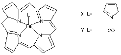 7.* (1996 F 13) Below are structural formulas for two iron porphyrins. The pyridine complex, X, is paramagnetic whereas the carbonyl derivative is diamagnetic. The pyridine complex strongly binds a second pyridine forming a diamagnetic bis-pyridine complex; however, the carbonyl complex, Y, only weakly binds a second carbonyl.