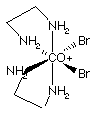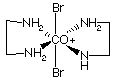 9.* (1996 2 3) Using only ethylene diamine (en = H2NCH2CH2NH2) and bromide anions as ligands construct a cationic octahedral complex of cobalt (III); your complex cation should have charge +1 and it should be chiral. Draw a three dimensional structure for this coordination complex below on the left. Then draw the structure of a diastereoisomer on the right. The chiral cation and its diastereomer are shown below. The diastereomer is not optically active because it has an internal mirror plane, S1= s.