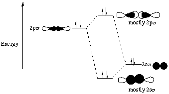 This is the same as the diagram from before except that the 2p s orbital moved up in energy while the 2ss orbital moved down in energy. (The fact that the 2ss orbital moved down in energy isnt obvious from the energy diagram on page III-16, but trust me, it happens.) This changed the relative energies of the orbitals so that the 2ps orbital is now above the "degenerate" (same energy) 2pp orbitals. Why did this crossover happen?!The important thing to realize here is that the orbital interaction ideas weve been learning apply not only to atomic orbitals, but to any kind of orbital. If two orbitals 1. have the same symmetry elements in the point group of the molecule and 2. are close to each other in energy, then it is possible for them to interact. What is the point group of N2? What symmetry elements of that point group do the 2s s and 2ps molecular orbitals possess? Can these molecular orbitals interact the way atomic orbitals can? You bet they can!!When atomic orbitals interact, we show their interaction by taking + and - combinations of their relative wavefunction phases. The bonding (+) combination has the wavefunctions in phase (overlap of two shaded or two unshaded orbital lobes) and the antibonding (-) combination has the wavefunctions out of phase (a shaded orbital lobe overlapping with an unshaded orbital lobe). In the case of two molecular orbitals interacting, the same + and - combinations have to be taken. Just to be extra clear, I am going to show pictures of the two contributing molecular orbitals (2s s and 2ps) on the sides as well as pictures of their + and - ("bonding" and "antibonding") combinations in the middle of the energy diagram.