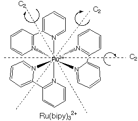Group Theory Solutions: #44.* (1996 1 2) List all the symmetry elements of Ru(bipy)32+ (shown below). What is its point group? Does it have a dipole moment? Is it chiral?