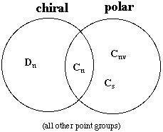 5.* (1995 1 4) Are all chiral molecules polar? Are all polar molecules chiral? What are the conditions for a molecule to be nonpolar? What are the conditions for a molecule to be achiral? The only molecules that are polar are those in the Cn, Cnv, and Cs point groups. For a molecule to be nonpolar, it must not be in the Cn, Cnv, or Cs point groups. A molecule is chiral if it does not have an Sn axis. Therefore, the only chiral point groups are Cn and Dn. All other groups are achiral. Not all chiral molecules are polar. Molecules in the Dn point group are chiral but not polar. An example is Ru(bipy)32+ (D3)