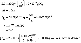 Suppose that a freshman, dismayed by the dorm food offerings, elects to eat 200 g of tuna fish every day. Suppose that the tuna fish provided by Food Service contains 1.0 part per million by weight of mercury. The half-life for elimination of mercury from the body is 70 days, and the toxic threshold where symptoms of mercury poisoning appear is 0.014g. Calculate the grams of mercury in our tuna addict at the end of freshman year, taken as 240 days. Is our tuna-fish-salad lover in any danger of becoming sick?