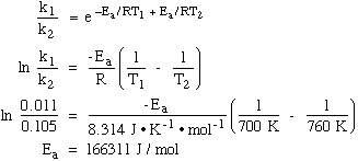 9.* (1994 F 5) The thermal decomposition of acetaldehyde (CH3CHO) was measured at two temperatures. At T=700K, the rate of this second-order process was 0.011 (mol/L)-1s-1and at T=760K it was 0.105 (mol/L) -1s-1.