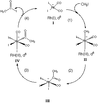 11.* (1994 2 4) The following is a list of reaction classes which encompasses the majority of the transformations of organometallic compounds: (a) ligand substitution or dissociation, (b) oxidative addition, (c) reductive elimination, (d) migratory insertion, (e) electrocyclization. Now consider the catalytic cycle of reactions which are known to occur in the Monsanto acetic acid process in which methanol combines with CO to form acetic acid: CH3OH + CO ---(Rh catalyst, I-)--> CH3CO2H