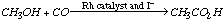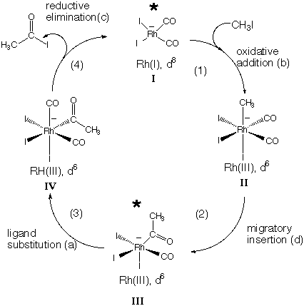11.* (1994 2 4) The following is a list of reaction classes which encompasses the majority of the transformations of organometallic compounds: (a) ligand substitution or dissociation, (b) oxidative addition, (c) reductive elimination, (d) migratory insertion, (e) electrocyclization. Now consider the catalytic cycle of reactions which are known to occur in the Monsanto acetic acid process in which methanol combines with CO to form acetic acid: CH3OH + CO ---(Rh catalyst, I-)--> CH3CO2H
