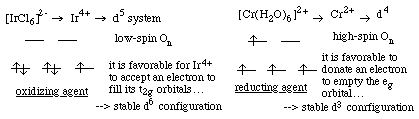 13.* (1993 3 1) Explain each of the following. A. Metal containers corrode more rapidly in dilute HCl than in aqueous H2SO4 solutions having the same pH. Corrosion is an oxidation process i.e. it involves electron transfer from the metal to an oxidizing agent. Cl- can act as a bridging ligand between the metal and the oxidizing agent. This will increase the rate of corrosion relative to H2SO4. B. The anion [IrCl6]2- is a strong oxidizing agent whereas the cation Cr2+ aqueous is a strong reducing agent.
