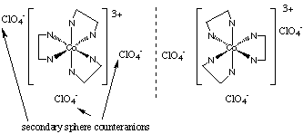17.* (1992 F 25) Consider the diamagnetic complex [M(en)3(ClO4) 3] where M is a 3d metal. A. What is M? M is Co (which is d6 in its III oxidation state.) B. What is the oxidation state of M? The oxidation state is III, because each ClO4- has a -1 charge. This way, we can also have a low-spin system. C. How many d electrons? There are 6 d electrons. D. Will this complex be a strong oxidizing agent? To be a strong oxidizing agent the complex must gain electrons easily. However, any electrons this complex gains will go into the high energy eg antibonding orbitals. Therefore, this compound won't be a strong oxidizing agent. E. Sketch a picture of all stereoisomers of this complex.
