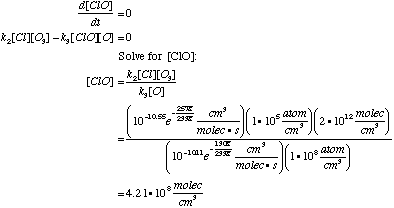 E. Use the information you have to estimate the steady-state concentration of ClO. From reaction (2), From reaction (3), The total rate of change in [ClO] is the sum of these:
