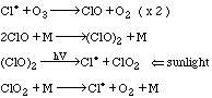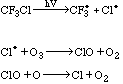 Yes. (see b) e. (O2)2. No. This doesn't even exist. f. H2O. No. g. sunlight in the IR. No. h. sunlight in the visible. No. i. electrical transmission lines: No. These do produce O3 but not in significant amounts. j. aerosols: YES. Aerosols are tiny droplets of liquid suspended in the air. They have very large surface area to volume ratios and supply surface for smog forming reactions to take place. k. chlorofluorocarbons (freons) No. CFC's are a problem for the environment but only the O3 layer which is separate from smog-causing O3 l. LACK OF atmospheric circulation. YES. 5.* (1994 F 8) Write chemical reactions leading to destruction of the ozone layer in the upper atmosphere by the introduction of chlorofluorocarbons (freons), explaining carefully the role of sunlight.