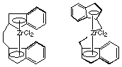 9.* (1994 F 12) We return to Prof Waymouths research on soluble catalysts which produce stereoregular polypropylene. Two stereoisomeric precatalysts are shown below. When these Zr(IV) metallocene stereoisomers are activated with aluminum alkyl, one isomer produces isotactic polypropylene; the other isomer produces atactic polypropylene. You are not told which catalyst produces which polymer. Recall that isotactic polypropylene is a high-melting, stereoregular polymer whose microstructure is a polymeric coil. By contrast, atactic polypropylene has a disordered, stereorandom microstructure; the atactic form is lower melting. Given the above facts and the structures depicted below for the two precatalysts predict which catalyst forms isotactic and which forms atactic polypropylene. (Hint: the polymerization process which determines stereoregularity occurs at the zirconium center.)
