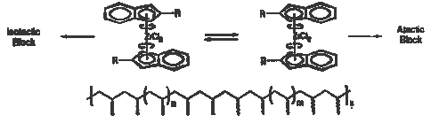 6.* (1995 F 16) Professor Waymouth at Stanford has invented a remarkable homogeneous catalyst which, when activated by an aluminum alkyl derivative, produces a block copolymer from propylene. This copolymer has alternating isotactic and atactic regions; it is an elastomer even though there are no covalent cross links between individual polymer chains. The active catalyst exists in two conformations (shown below); these slowly interconvert during the catalytic reaction.