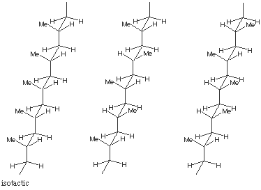 5.* (1996 3 3) Write in turn the stereochemical structures of isotactic, syndiotactic, and atactic polypropylene. Indicate which form is the most stable in solution (has the lowest free energy) and which would have the lowest melting point. Briefly explain your answer.