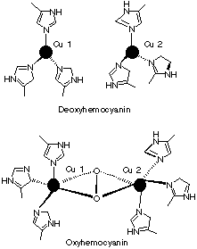 1.* (1997 F 9) Identifying the useful spectroscopy. Hemocyanins, non-heme bimetallic copper proteins, are oxygen carriers in anthropods such as spiny lobster. Below the core structures of deoxy- and oxyhemocyanin are displayed. The protein which provides the histidine ligands is not shown. Deoxyhemocyanin has both copper ions in the +1 oxidation state. Oxy-hemocyanin is diamagnetic.