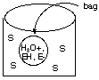 The walls of the bag will not let EH or E- pass through them but are permeable to all other species. Initially, S starts to diffuse into the solution of EH and E- inside the bag. This diffusion process is slow. As S slowly diffuses into the bag, it reacts only with the EH form of the enzyme. At first the reaction rate is small because [EH] is small compared to [E-], but as products are formed (more rapidly than they can diffuse from the bag), [H3O+] increases inside the bag and shifts the rapidly attained enzyme equilibrium to make [EH] increase, which speeds up the reaction with S until a point is reached where S is consumed by reaction more rapidly than it can diffuse into the bag. Following this point P- and H3O+ must diffuse from higher concentration to lower concentration through the bag walls so that the enzyme concentration shifts to the right again lowering [EH] and returning to our starting point. B. Make a rough plot of [H3O+] versus time inside this diffusion-controlled bag (cell) reactor. C. Suggest how the [H3O+] concentration variation with time could be visually monitored inside the bag. D. Suppose the product P- has a characteristic UV absorption feature that is different from the UV absorption spectrum of S. Explain how the concentration of P- in the solution inside the container but outside the bag might be monitored in time.