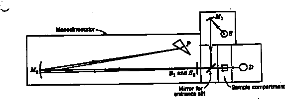 The source is a battery-operated tungsten lamp that provides a "white" light for operation in the visible. A mirror M1 sends a beam of light from this source through the entrance slit S1 into the monochromator. This beam is reflected to a quartz prism by the collimating mirror M2. The prism P is of the so-called Littrow type so that the light undergoes refraction on entering the front surface, is relected from the solvered back surface, and undergoes a second refraction on leaving the prism. When the prism is rotated, a narrow band of light, which is nearly monochromatic at any desired wavelength in the visible, can be passed throught the exit slit S2. A sample cell, with plane parallel windows, is mounted in the sample compartment between the exit slit and the photodetector D. All light that is transmitted by the sample falls on the detector whose photocurrent is amplified and recorded. The magnitude of the photocurrent is proportional to the intensity of the transmitted light. a. Suppose you were given an aqueous solution of Ru(bipy)32+ of unknown concentration [x] in units of moles/liter. Suppose also that you had available 10 g of pure Ru(bipy) 32+. Carefully explain what operations you would undertake to determine the value of [x]. Some possibly useful information follows: For Beer's law, I = Ioe(-ecl); Ru(bipy) 32+ has the chemical formula Ru(C10H8N2) 3, and the atomic weights are Ru = 101.07 g/mole, C = 12.011 g/mole, H = 1.008 g/mole, and N = 14.007 g/mole. B. Prepare a set of instructions for a beginning student explaining how you would use the instrument shown in the figure to obtain an absorption spectrum of an aqueous solution of Ru(bipy)32+. C. The ionic species tris (2,2-bipyridine) ruthenium(II) Ru(bipy) 32+ has the structure