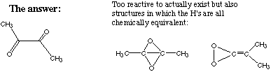 B. Closer inspection shows that in addition to the ion at m/z = 86 there is a weaker mass peak at m/z = 87. The intensity ratio of the weaker to the stronger is 4.7% plus or minus 0.5 %, where the uncertainty represents a 99% confidence level. What can you conclude about the molecular formula for compound X? The peak at m/z = 87 is probably due to the occurence of one atom of 13C in the compound. 13C occurs instead of 12C one ninetieth of the time. The expected intensity ratios for each of the four preceeding possible compounds are as follows: C6H14: I87I86 = [6*(89/90) 5 (1/90) 1] / [(89/90) 6] = 6/89 = 0.067 C5H10O: I87I86 = [5*(89/90) 4 (1/90) 1] / [(89/90) 5] = 5/89 = 0.056 C4H6O2: I87I86 = [4*(89/90) 3 (1/90) 1] / [(89/90) 4] = 4/89 = 0.045 C3H2O3: I87I86 = [3*(89/90) 2 (1/90) 1] / [(89/90) 3] = 3/89 = 0.033 Therefore, we can say with 99% confidence that X is C4H6O2. C. 1H NMR of compound X shows one peak. What are the chemically sensible structures for compound X? One NMR peak implies that all the H atoms are magnetically equivalent.