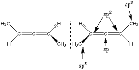 These are enantiomers, but they cannot be distinguished based on the given information. C. Are there any chiral carbon centers in X? No. This is a chiral molecule without chiral centers. D. Indicate the hybridization states of each carbon in X by drawing an arrow from the symbols, sp, sp2, and sp3 to these carbon atoms. Hybridization states indicated above. |