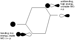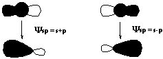 When constructing MO diagrams remember: 1. Conservation of energy dictates that bonding, antibonding, and nonbonding orbitals be combined so that their energy adds up to that of the atomic orbitals. This means (roughly speaking) that for every bonding orbital there should be an antibonding orbital. 2. The number of MOs you end up with must equal the number of AOs (atomic orbitals) from which they are formed. When we started with 2 H 1s orbitals, we got out 2 MOs. If you start with 3 2p orbitals, youll get 3 MOs out, etc. 3. Atomic orbitals interact with each other only if they have similar energies and the same symmetry about the internuclear axis. The most common symmetries to have about the internuclear axis are C-infinity or "cylindrical symmetry" and C2 antisymmetry. These are the symmetries of sigma and pi bonds, respectively, where sigma bonds are comprised of s and pz orbitals and pi bonds are comprised of parallel p orbitals. The diagram above illustrates the interaction of an s orbital with a pz orbital along the internuclear axis. 4. Interactions only happen if they stabilize the molecule. If all of the bonding and antibonding orbitals are filled, then the molecule is not stabilized because the energy of its electrons is not lowered. 5. Head-on interactions (C-infinity symmetry about the internuclear axis) are "better" than side-on interactions (C2 antisymmetry about the internuclear axis) because the orbital overlap is more effective. Therefore head-on interactions should be shown as lowering the energy of the bonding MO (and increasing the energy of the antibonding MO) more side-on interactions. 6. In the "LCAO-MO" numbering scheme, each MO is named with the Greek letter sigma or pi and then numbered from most stable to least stable. 7. MOs have the character of the component atomic orbital to which they are closest in energy. This is a consideration only if the component atomic orbitals start out at different energies. In the picture above, the bonding molecular orbital has more s character and the antibonding orbital has more pz character. 8. Although the lobes are shown above with opposite sign, the square of the molecular orbital wavefunction (not shown) has the same sign in both lobes. The square of the wavefunction represents the probability density distribution, or where the electrons are likely to be found. 9. The more nodes a wavefunction has, the higher its energy. Hybrid orbitals: Like molecular orbitals, hybrid orbitals are formed from the combination of atomic orbitals. The atomic orbitals comprising hybrids, however, come from the same atom. This distinction is very important. You will recall that molecular orbitals form in bonding and antibonding combinations; hybrid orbitals have equivalent energies. For example, the wavefunctions for the two sp hybrids are of the form Y = (1/2)1/2(Y2s + Y2p) or Y = (1/2)1/2(Y2s - Y2p). The two orbitals are equivalent. Note the shape and signs of the lobes for the wavefunctions shown below.