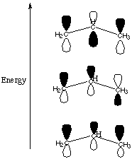 Notice that since we started with three atomic p orbitals, we had to come up with three molecular p orbitals. The number of contributing atomic orbitals always equals the number of orbitals you end up with. The best p-type overlap is exhibited by the lowest energy (most bonding) orbital. In the middle orbital there is one nodal plane and in the highest energy (most antibonding) orbital there are two nodal planes. D. Each of your molecular orbitals can accomodate two electrons. Which orbitals are filled? What does this tell you about the electron density in this allyl cation system? We start with two electrons in the p system as explained in part B. Therefore only the lowest energy molecular orbital in part C is filled. This tells us that the electron density is spread out over all three of the unhybridized p orbitals. E. Where is the positive charge in the allyl cation? Just like the electron density, the positive charge in this system is spread out over all three carbons in this system. We will study this phenomenon in the section on organic chemistry and call it "resonance." The fact that the electron density and the positive charge are spread out over the whole p system has vast repurcussions for organic reaction chemistry. |