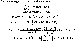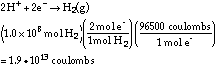 1 mol electrons = 96,500 Coulombs 1 amp = 1 coulomb/sec One watt = 1 Joule/second = 1 amp x 1 volt A. How many coulombs of electrical charge would be required to generate 1 x 108 moles of H2? ![]()