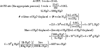 F. Make a rough estimate of the weight (in tons) of a ship at a depth of 2 miles in the ocean that can be refloated using 1.0 x 108 moles of H2 to displace water. Some useful conversion information is 1 mL of water weighs 1 g, 454g = 1lb, 2000lbs = 1 ton, and Archimedes principle states that "when a body is immersed in a fluid it experiences an upward thrust equal to the weight of the volume of fluid displaced." Take the temperature of the water at the bottom of the ocean as the same as on the surface of the ocean. ![]()
