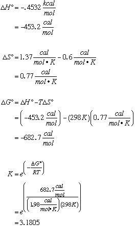 29.* (1992 F 17) Consider the reaction diamond --> graphite. DH0 of diamond = 0.4532 kcal/mol and DH0 of graphite = 0 kcal/mol. DS0 of diamond = 0.6 cal/mol*K and DS0 of graphite = 1.37 cal/mol*K. Calculate the equilibrium constant for this reaction at 250C, 298K. As temperature increases, what happens to the equilibrium?