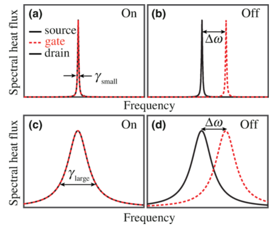 I developed the theory of a thermal switch based on resonant coupling of three photonic resonators, in analogy to the field-effect electronic transistor composed of a source, a gate, and a drain. As a material platform, I capitalize on the extreme tunability and low-loss resonances observed in the dielectric function of monolayer hexagonal boron nitride (h-BN) under controlled strain. I controbute to proposing a strain-controlled h-BN–based thermal switch that modulates the thermal conductance by more than an order of magnitude, corresponding to a contrast ratio in the thermal conductance of 98%, in a deep-subwavelength nanostructure. We therefore presented a scheme of robust on/off states in switching the flow of thermal currents, in analogy to the electrical conductance that can be widely modulated within the same material.