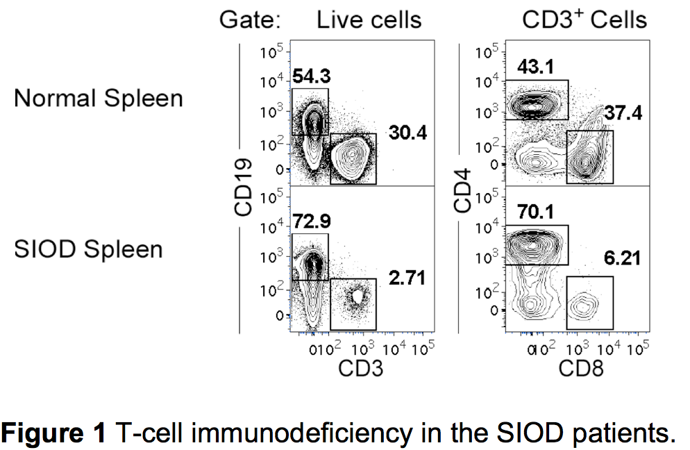 Schimke immuno-osseous dysplasia (SIOD) is an autosomal recessive, incompletely penetrant, childhood disorder associated with skeletal dysplasia, renal dysfunction, and T-cell lymphopenia (Figure 1). The representation of T-cell subsets in SIOD patients is further characterized by a high proportion of memory (CD45RA-CD45RO+) T cells, however, the etiology of T-cell immunodeficiency has not been elucidated. I found that T cells in individuals affected by SIOD express markedly reduced surface levels of IL-7 receptor alpha chain (CD127) as compared to their unaffected sibling or normal individuals. This reduction in IL-7 receptor alpha chain was observed in all T-cell subsets including naïve T cells. This suggests that the origin of the IL-7 receptor alpha chain deficiency is likely intrathymic, rather than occurring after emigration to the periphery. In addition, T cells from SIOD patients proliferate poorly in response to stimulation with IL-7, indicating a loss of functional receptor. From these observations, I propose the lack of functional IL-7 receptor expression in T cells, and possibly their earlier progenitors, may have restricted T-cell development in SIOD patients. Currently, I am trying to elucidate the mechanism for this reduced IL-7 receptor expression.