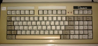 The Telerate keyboard was used for financial applications, as is clear from the keycaps. This keyboard (in the old XT version, without e0 prefixes) has four additional keys, with scancodes 61, 62, 63, 64. The F11 and F12 keys have scancodes 54 and 55 (instead of the common 57 and 58). There are two LEDs (for CapsLock and NumLock).