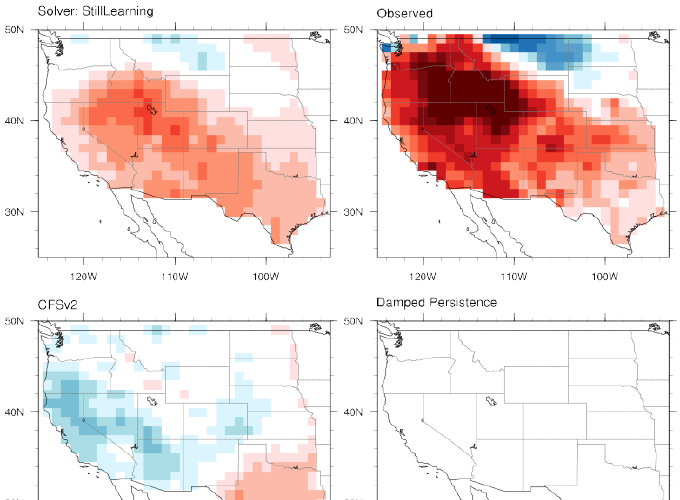 To improve the accuracy of long-term forecasts, the Bureau of Reclamation and the National Oceanic and Atmospheric Administration launched the Subseasonal Climate Forecast Rodeo, a year-long real-time forecasting challenge, in which participants aimed to skillfully predict temperature and precipitation in the western U.S. two to four weeks and four to six weeks in advance. Here we present and evaluate our machine learning approach to the Rodeo. Our system is an ensemble of two regression models, and exceeds that of the top Rodeo competitor as well as the government baselines for each target variable and forecast horizon.