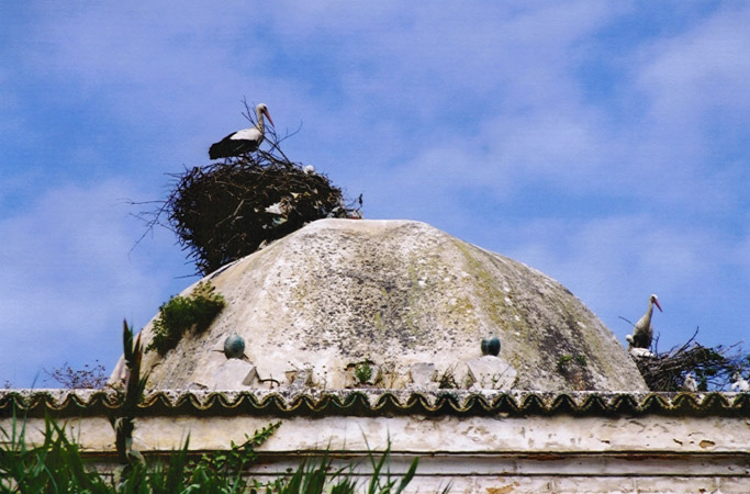 We had a really nice breakfast in the hotel—complete with eggs, bread, orange juice and coffee—the best and most complete we have had. We walked south to Chellah, a walled city built by the Merenids in the 13th century. Also within the walls were the remains of the ancient Roman city of Sala Colonia. Actually most prominent were the storks in the trees, on top of the minaret, flying about, taking care of their young—everywhere. It looked like a bird refuge. We could see the ruins of a mosque, complete with a medersa. There was also an eel pool (I saw a couple), presided over by a semi-official person. He fed boiled eggs to the eels to make them come out; women having trouble getting pregnant do the same. He also was taking care of six kittens whose mother had died. They looked about the age where they could be given away. There was a man with an identity card drawing the designs from some of the ruins, as a way I guess to preserve the heritage.