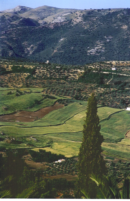 We walked back home to rest up a bit—it had already been a long, hot day. Philip wanted to take another walk down to the valley which we had seen from our terrace—but wanted to take it in the cool of the evening. On the way back, I bought some painted pottery: a small bowl for myself and 4 teabag-size little dishes from a little store near the bridge that sold a combination of new and antique things. It was more fun than buying things from a ticky-tacky souvenir store. I had eyed painted bowls in both Spain and Morocco but knew I didn’t want to buy a big one to carry back. The little store was on the old side of the bridge, on the right-hand side with one’s back to the new city.