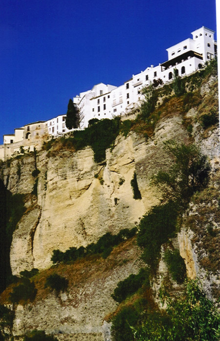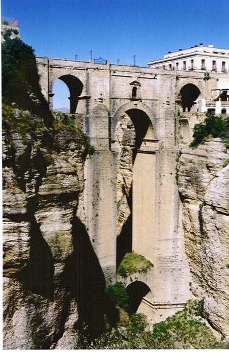 We decided to have breakfast at the hotel. The morning view from our terrace was just as beautiful as last night. It was a busy day—we knew we only had one day. First we had to go on foot from the new city to the old—not very far. The way into the old city was via a beautiful old bridge with three spans. The Parador hotel, where we did not stay, sits on the edge of the chasm, just before the bridge. We started on the walk recommended by Dorling Kindersley guide book. The first stop was the “House of the Moorish King”—its main feature was the 365-step staircase down to the river which we had just crossed. The stairs gave access to the water, but the purpose of the rooms off of the stairs is unclear—whether baths or prisons—it felt like a prison to me being cold and damp. At the bottom, the river was polluted, but we could see up the limestone cliffsto the city is spectacularly above—no wonder it was almost impregnable.