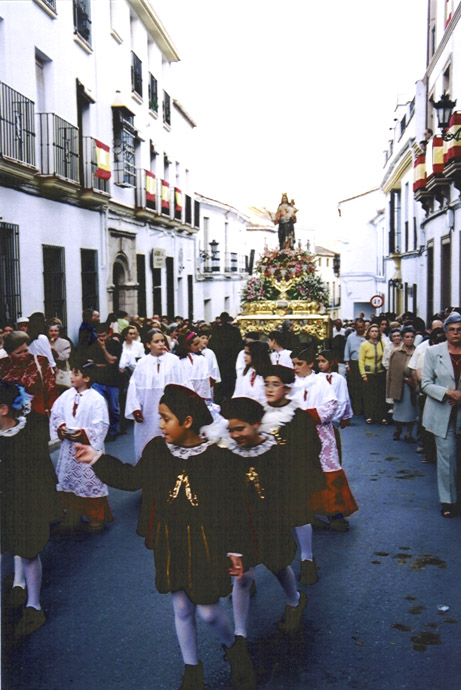 My goal was to go look for the procession—for it was that time. Philip had said with Spanish time, it would be better to start looking at 8:30. Earlier in the evening, we had seen a little girl in a long, white dress, obviously on her way to the procession—I think it had something to do with first communion. We came upon a line of dressed-up, chattering women—I figured that they were on their way to the procession. We just followed them and of course came right to the procession—we saw the white carnation float and also one that we had not seen in the morning. This procession was different from the one we had seen in Sevilla although some elements were the same: headed by a cross-bearing boy, incense wafting back and forth, music. But this one had no long candles wielded by the participants and was more elaborate. The float in Sevilla was carried by people who were hidden by long curtains that fell to the ground (except we could still see their feet). The first two floats in this larger procession were carried by boys and girls who carried them on their shoulders in full view of the passersby—they had little cushions/pillows on their shoulders to pad themselves from the wooden poles. The third and largest float had its bearers hidden inside.