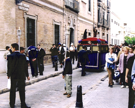 We took the walking tour around Macarena after, making sure to hit the 3 highlights: the convent, Iglesia de San Marcos, and Iglesia de San Pedro. Other highlights of the walk: watching a flamenco class for children (closest we got to seeing flamenco), seeing a procession called Cruz de Mayo, complete with drum and horn players, children walking with long candles, incense smoke coming from a censer which was swung back and forth by an altar boy, a float propelled by maybe a dozen people whose feet only were visable. It was wonderful to see. I thought it was a good way to spend the first evening, when we were perhaps too tired to tackle Sevilla itself.