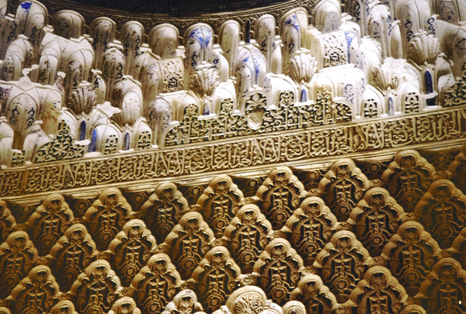 The enclosed space of the Alhambra is shaped like a boat with the Acazaba (military quarters) at the prow, castles down the right-hand side. The first area we entered was the Carlos V palace—only the circle-shaped, two-story courtyard, kind of like the Roman arena. We were late for our Nasrid palaces tour but were able to get in anyway. This was a series of palaces and a series of rooms and courtyards within each. Again, as in the palace in Sevilla, Moorish motifs: lacy decorations of plaster, arches, reflecting pools. Who did all that work? Wonderful, talented artisans. It was fun imaging being a member of the royal household floating around in my robes.