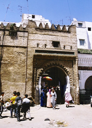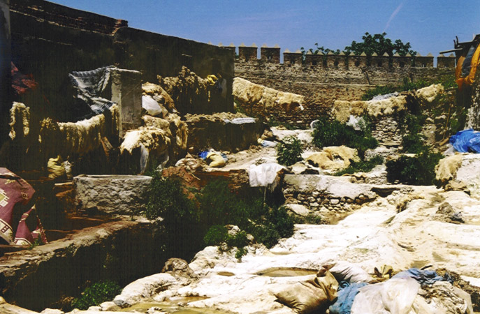 The travel agency from whom we needed to buy the tickets to get a bus and train to Fes was closed for midday so Mohammed helped us to check our bags at the local bus station. Then we were free to walk around. Of course, we got a tour of the medina—our first in Morocco. It was everything we had been led to believe and more—a maze of twisty little streets lined with all kinds of shops. Different sections sold different things: vegetables, fruit, fish, cloth, brassware, etc. It was a fascinating experience and a great introduction to Morocco. After seeing this one medina, the others (Fes and Marrakesh) were kind of old hat.
