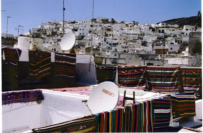 Lyn Zais was right—entering Morocco was like going into another world. I had been reading parts of her account loud to Philip while we drove from Sevilla to Algeciras. We could see the ocean; it was hot; people in djellabah were wandering around all over carrying bags of stuff. First we got into a taxi for a short ride to the border. It was very hot and dusty with people and cars going in all directions and rows of young men lining the hills around the border crossing, apparently just watching the people coming and going. Without our guide we would have had no idea where to go, but we just followed Mohammed from the taxi to a window in a small office, where we handed over our passports and filled in forms. Then we changed money for the first time into dirhan. Then it was a much longer taxi ride into Tatouan to catch the bus/train.