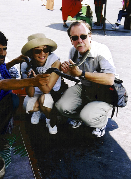 Next was the medina, already described above. We ended up in the Djemaa el-Fna—very different during the day—same juice guys but more entertainers. We found a snake charmer who draped snakes around our necks—our guide said I was brave! He didn’t know I actually like snakes and am not at all afraid of them. Anyway, they had been defanged and so were not dangerous.