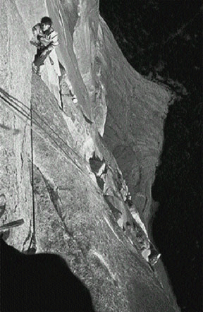 In Yosemite Kendall saw that the magnificent visual situations encountered could best be captured with a small camera carried on the body--not in the pack--and used as the action unfolded, pitch by pitch. He chose a folding Kodak Retina II 35-mm camera, using fine-grained, ASA 32, Panatomic-X film. Kendall wrote that a camera "is one of the last pieces of nonessential equipment to be discarded in preparation for a difficult ascent. In one way, however, a camera is an essential piece of equipment because, beyond tenuous memory, photography is the only means by which the climber can relive and reenjoy the qualities of an ascent."