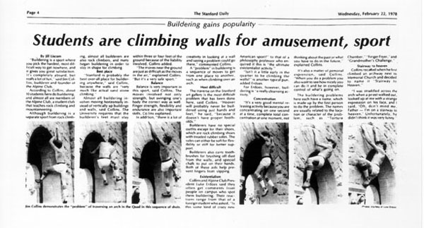 Jim Collins, sporting his distinctive leather cap, shorts, tube socks, and EB rock shoes, was a familiar campus sight in the late 1970s, cruising the back wall of Building 260 or the Art Gallery. Collins, an applied math major, never had so much to do that he wouldn't take time out of his regimen to encourage and advise another wall climber. "The University is the ideal place for practicing rockclimbing by way of buildering--the art of climbing walls," Collins told a Stanford Daily interviewer in 1979. "The sandstone blocks are ideal for climbing, though extremely difficult. In fact, the most difficult rockclimbing challenge in the world is in the Quad."