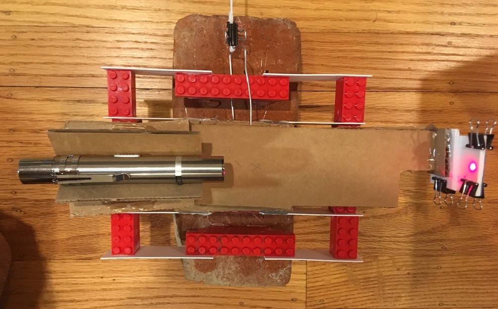 Another task was to translate the laser as precisely as possible in one direction while minimizing parasitic motion. I used lego pieces, superglue, and plastic to create a double compound leaf flexure. I used a rubber band to provide strain attenuation, letting me move the laser much more finely than I could actually measure with the tools at hand.