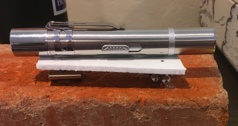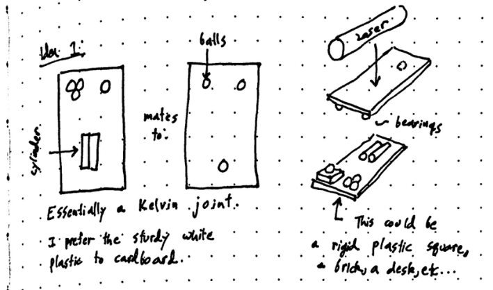 One task was to design a mount such that a laser pointer could be removed and replaced while changing the laser dot's position as little as possible. I created a "Kelvin clamp" using gage pins, ball bearings, and hot glue. In 30 trials at a distance of 100 yards, the laser dot's position barely moved after repeatedly removing and replacing the pointer; we estimated an angular repeatability of 120 microradians (0.007 degrees).