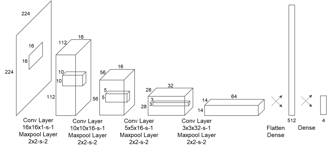 Architecture: Instead of using state-of-the art classifiers such as ResNet, AlexNet, LeNet, VGG-16, I designed my own architecture suited to my needs. CNN based classifiers were built using the Keras library that uses tensorflow-v2 as its backend. I stacked four {convolution + relu + maxpooling} modules followed by two fully connected layers (see figure below). Convolution filters operated on 16×16, 10×10, 5×5, and 3×3 windows with a stride of 1 and the same padding. Our maxpooling layers operated on 2×2 windows with a stride of 2. There were 16, 16, 32, and 64 filters, respectively, for each convolutional layer.
