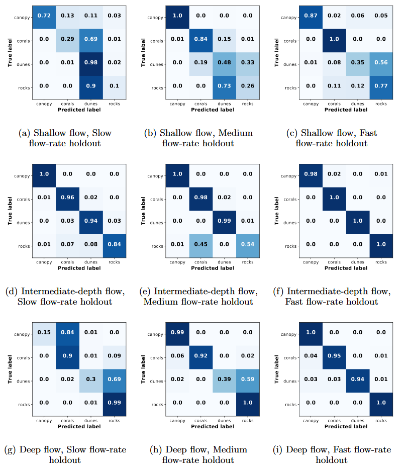 To examine whether a measurable signature of the different bedforms was present at the free surface, I trained nine different CNNs on sets of images acquired from flows with different bedforms and flow conditions but no wind ruffles. The nine CNNs differed in that their training and training-development sets consisted of images taken for all four bedform types but only eight of the nine different flow configurations. The images for the remaining flow condition (but again for all four bedforms) constituted the test set. These are called the 1-holdout test cases. Below are the confusion matrices for the 9 different holdout-models. I also quantified the overall percent accuracy for all cases.